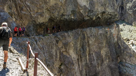 Nach einer kurzen Busfahrt steigen wir durch ein verwinkeltes Tal zur Uina-Schlucht hinauf. Auch diese Route wurde einst von Schmugglern und Händlern genutzt, um Güter aus mediterranen Regionen über die Alpen zu liefern. Hierzu wurde ein Weg in die Felswände einer Schlucht gesprengt. Kaum zu glauben, dass diese Route früher mit Zugpferden und Weidevieh durchquert wurde. Nach der imposanten Schlucht überqueren wir die Grenze nach Italien und staunen über den atemberaubenden Ausblick auf die Ortlergruppe. Schließlich lassen wir es uns in einer traditionellen Südtiroler Alm bei selbstgemachten Kuchen und gutem italienischen Espresso gut gehen.